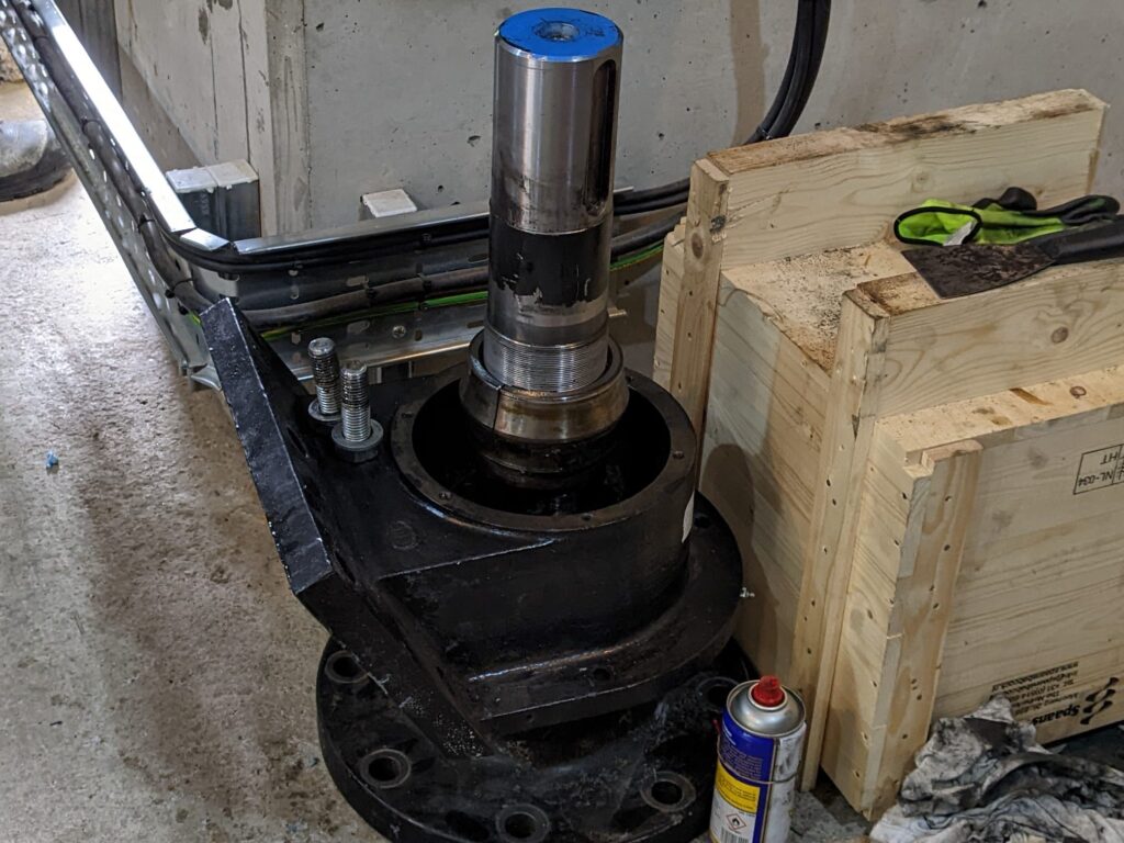 We have an automatic condition monitoring system fitted to the turbines and, early on 13th May, we received a Red alert alarm for the bearing that supports the top end of the Archimedes Screw. Spaans Babcock, who made and installed the turbines, came straight to site, and told us that we needed to shut that turbine down. The bearings should last 10-15 years so the failure was not expected. Spaans had to order some spare parts, and then arranged to come and replace the bearing, under warranty, starting on 30th May. The turbine started running again on 1st June.